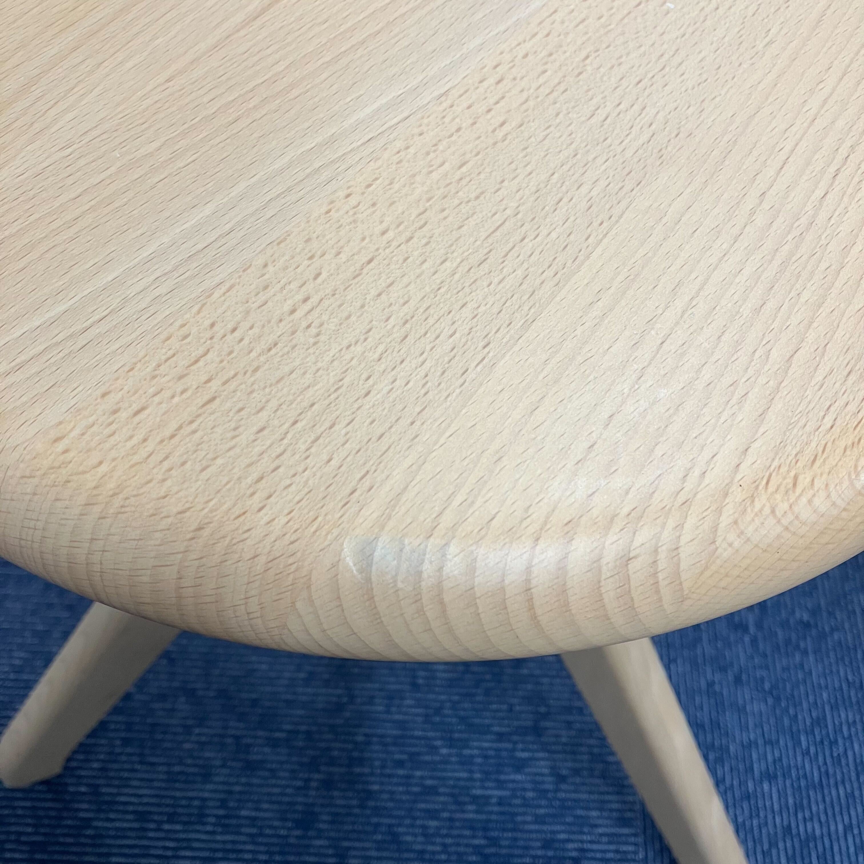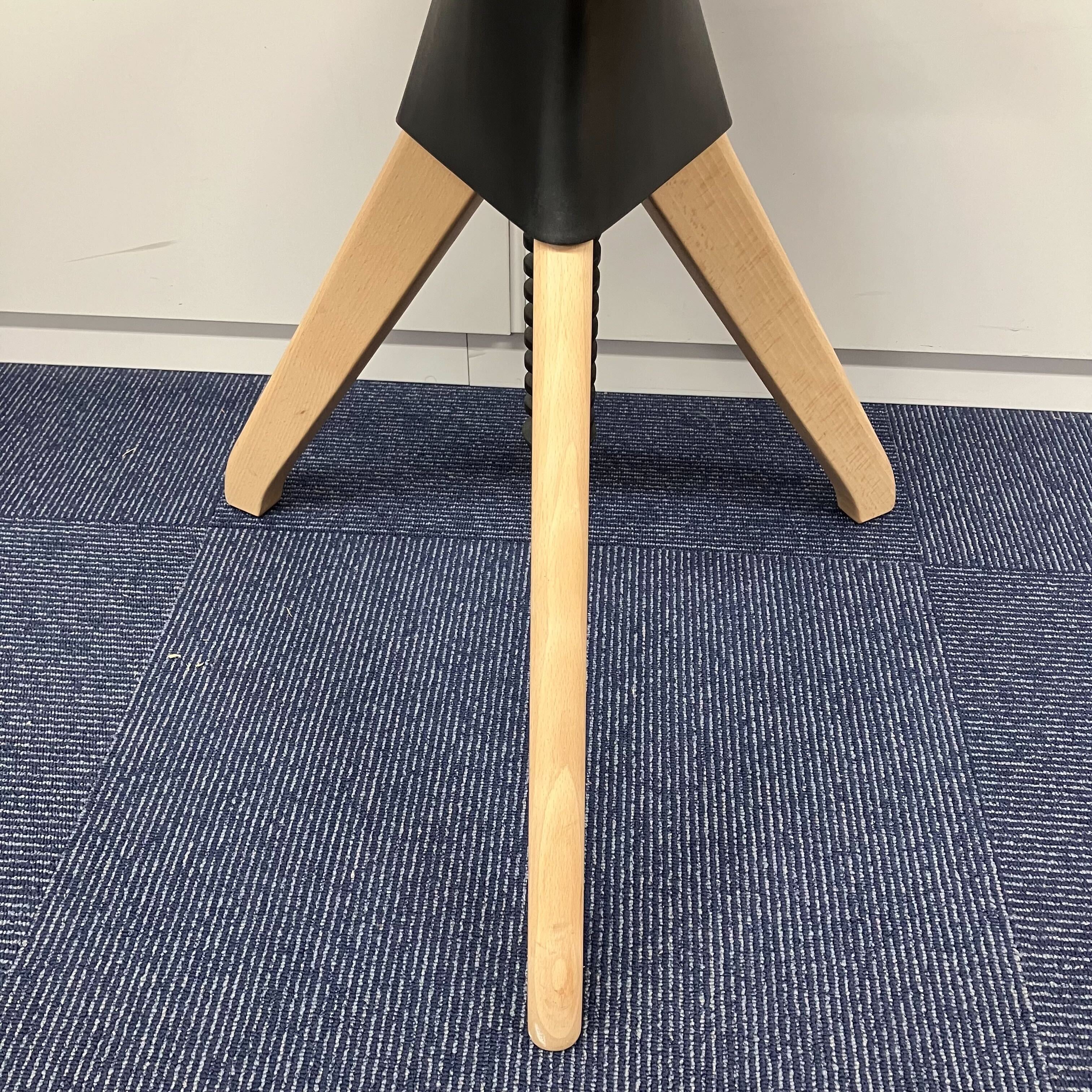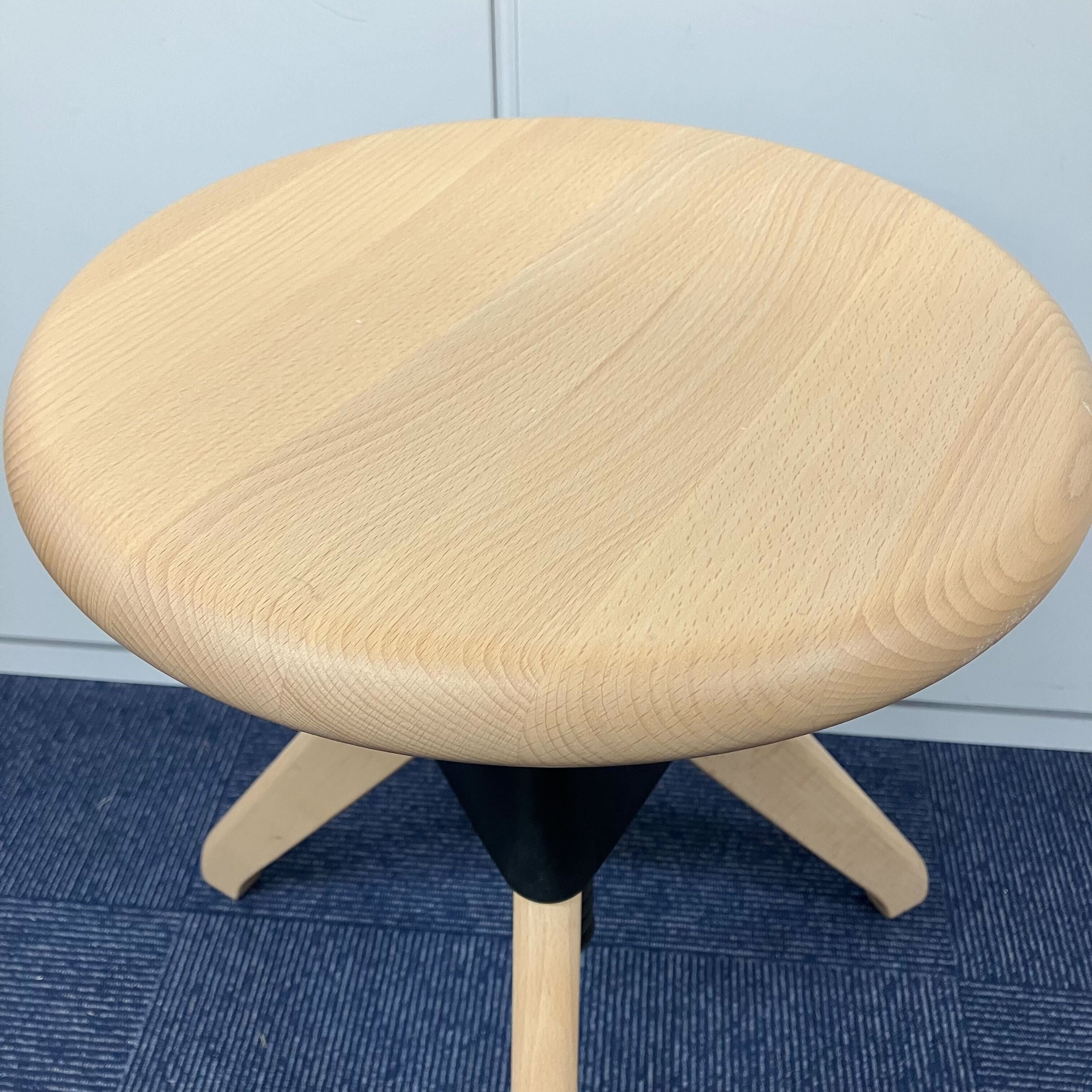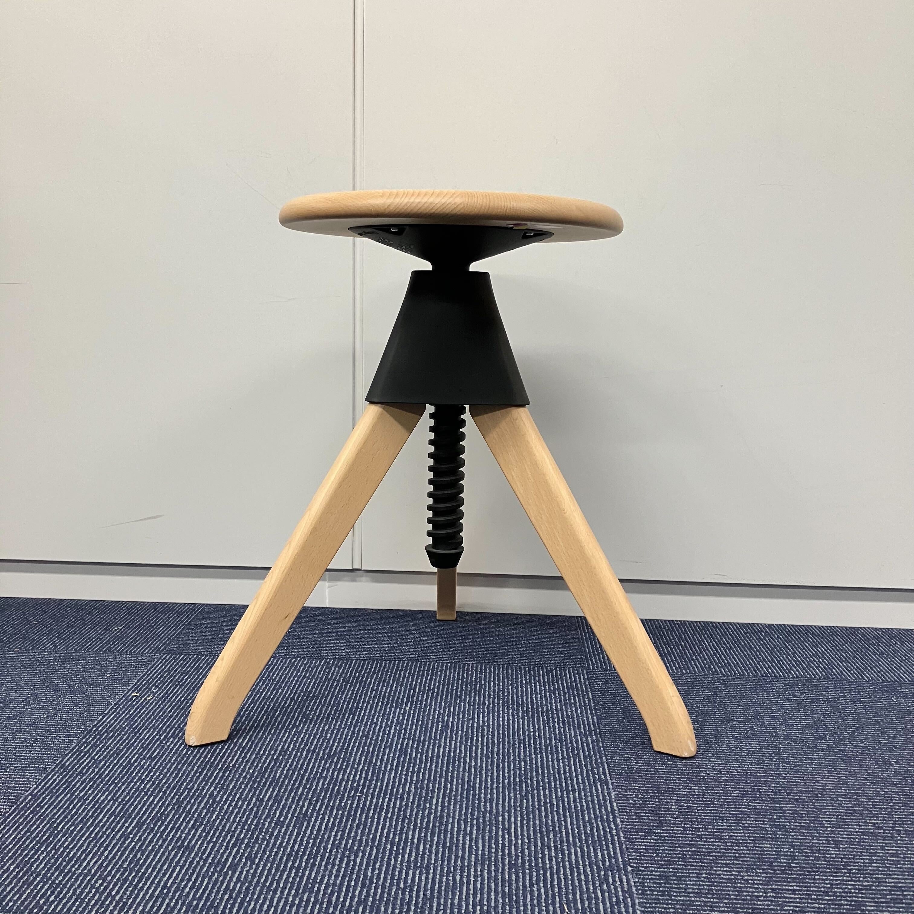 座面はネジのように回転させることで、16cmもの高さ調節が可能。古典的な作業用スツールの構造を持ち、機構部に使われた色鮮やかな樹脂と、木の質感との対比が斬新な印象を与える。 ワークシーンのみならず、キッズ用のチェアやキッチンスツールとしても幅広く使うことが可能。