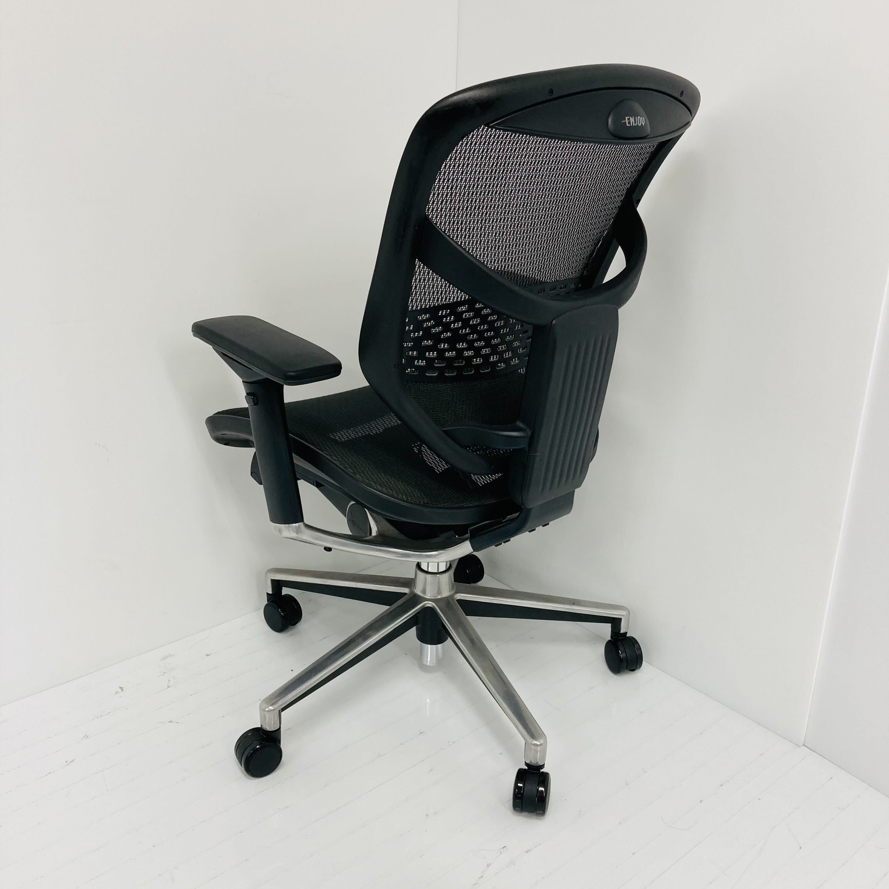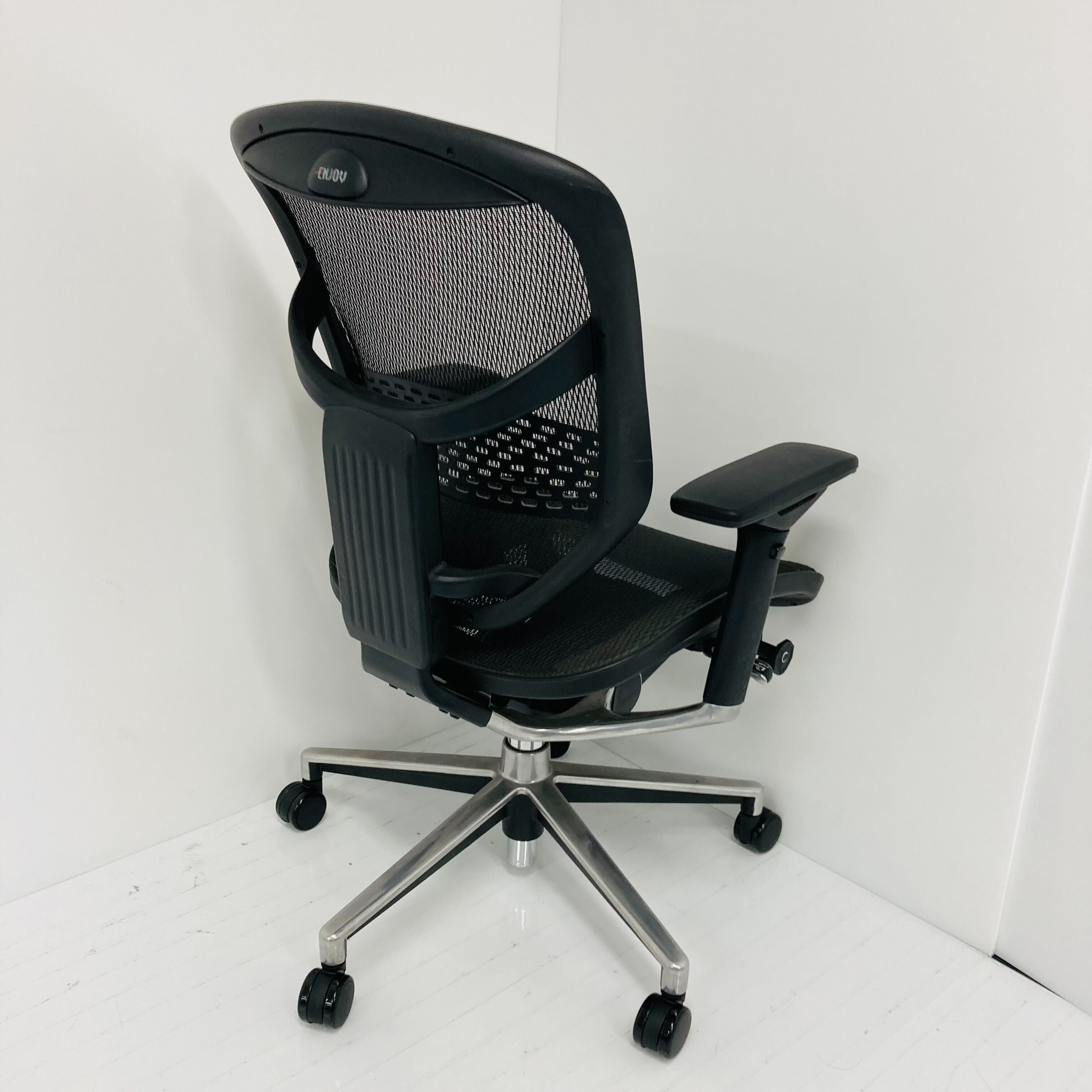 ENJOY(エンジョイ)は、Ergohuman(エルゴヒューマン)のオフィスチェア。ランバーサポートの調整により、最適なサポートを実現しています。張り地のメッシュ素材は耐圧分散・耐久性に優れており、様々な調整機能も装備しデスクワークも捗ります。流線型の美しいストリームラインシェイプを取り入れたデザインになっています。豊富なカラーバリエーションの中から選択可能です。アームレストの左右調節や角度変更、リクライニングロッキングも可能なので体型に合わせて快適な姿勢に調節できます。ユーザーに合わせて作られたオフィスチェアです。