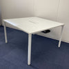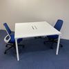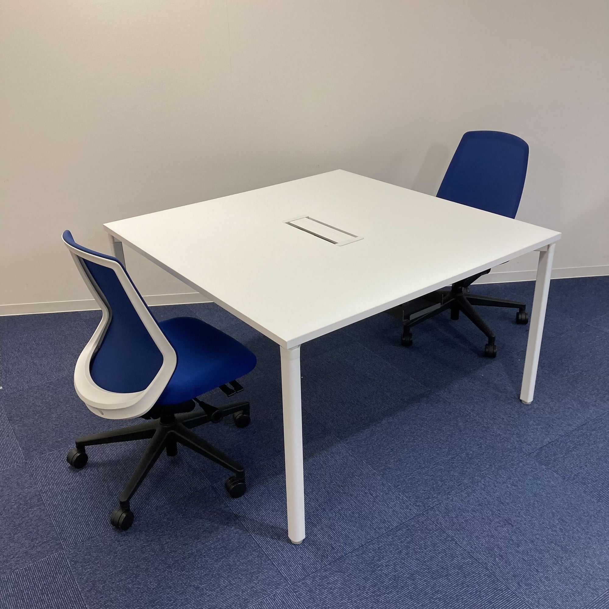 ■テーブル:4本脚 配線口・配線カバーあり ■チェア:ミドルバック 5本脚(ブラック) ホワイトフレーム 肘なし ナイロンキャスター ランバーサポート無 ジャケットハンガー無