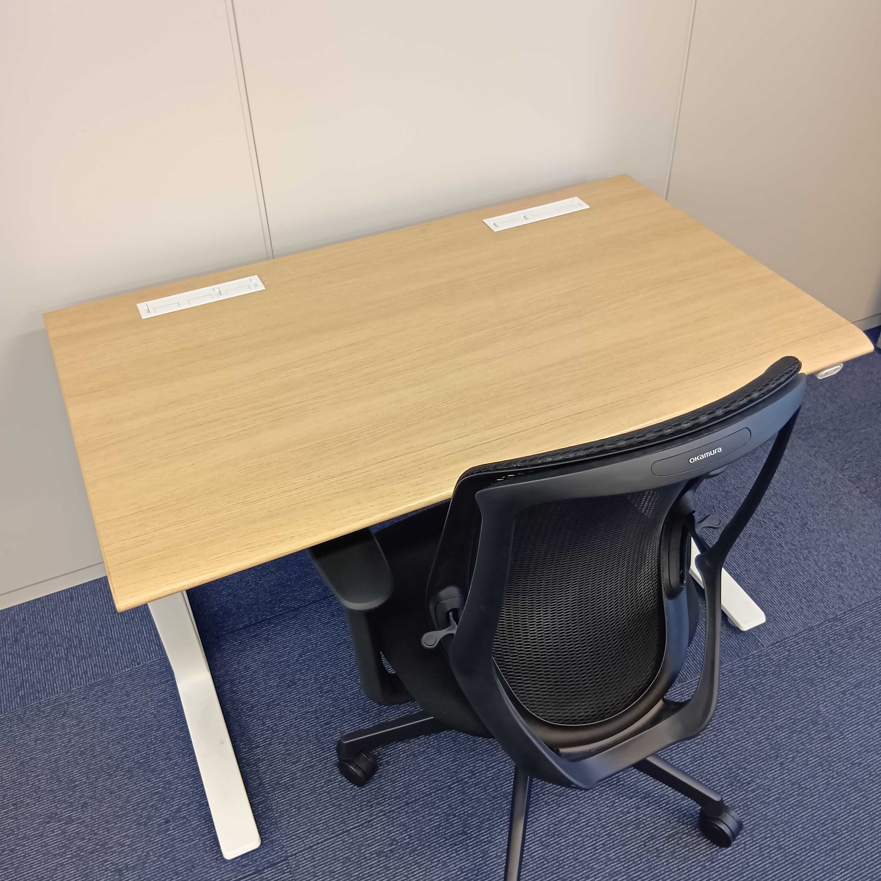 テーブル:昇降タイプ / 脚部仕様:L字脚 / 配線:2箇所 / トレー:無 / 幕板:無 / 鍵仕様:無